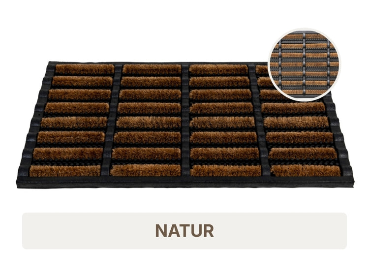 Die Lorima-Matte ist eine besonders robuste Lösung für den Außenbereich und überzeugt durch ihre Materialkombination aus 60 % Gummi und 40 % Kokosfasern. Mit einer Höhe von 25 mm entfernt sie zuverlässig groben Schmutz und Feuchtigkeit von den Schuhen und sorgt so für einen stets sauberen Eingangsbereich. Durch die Kombination aus stabilen Kokosborsten und einer schweren Gummistruktur bleibt die Matte fest an Ort und Stelle, auch bei intensiver Nutzung oder schlechtem Wetter. Erhältlich in verschiedenen Größen, eignet sich die Lorima-Matte perfekt für Haustüren, Terrasseneingänge oder den Balkon und verbindet Funktionalität mit einem natürlichen Look.